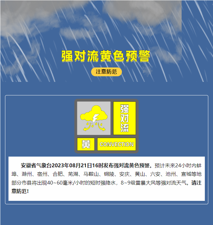 安徽省氣象臺(tái)2023年08月21日16時(shí)發(fā)布強(qiáng)對(duì)流黃色預(yù)警