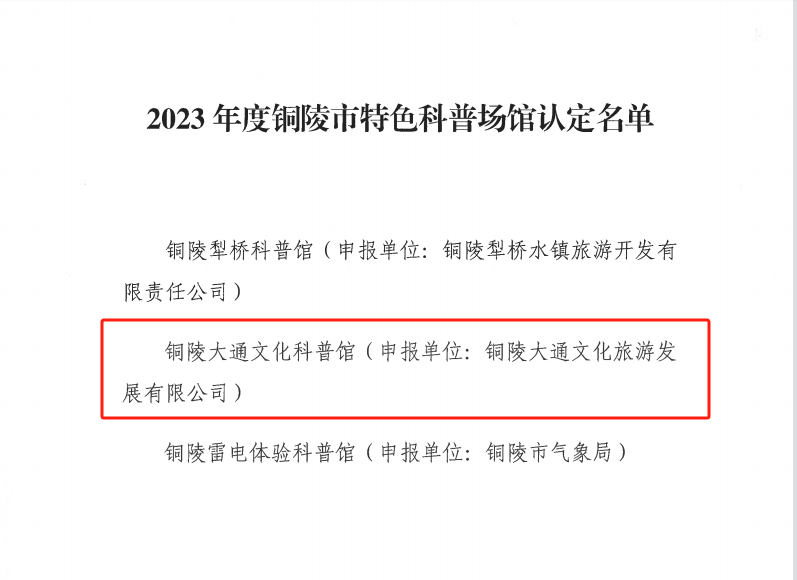 喜訊!銅陵大通文化旅游發(fā)展有限公司榮獲“2023年度銅陵市特色科普場館”稱號!